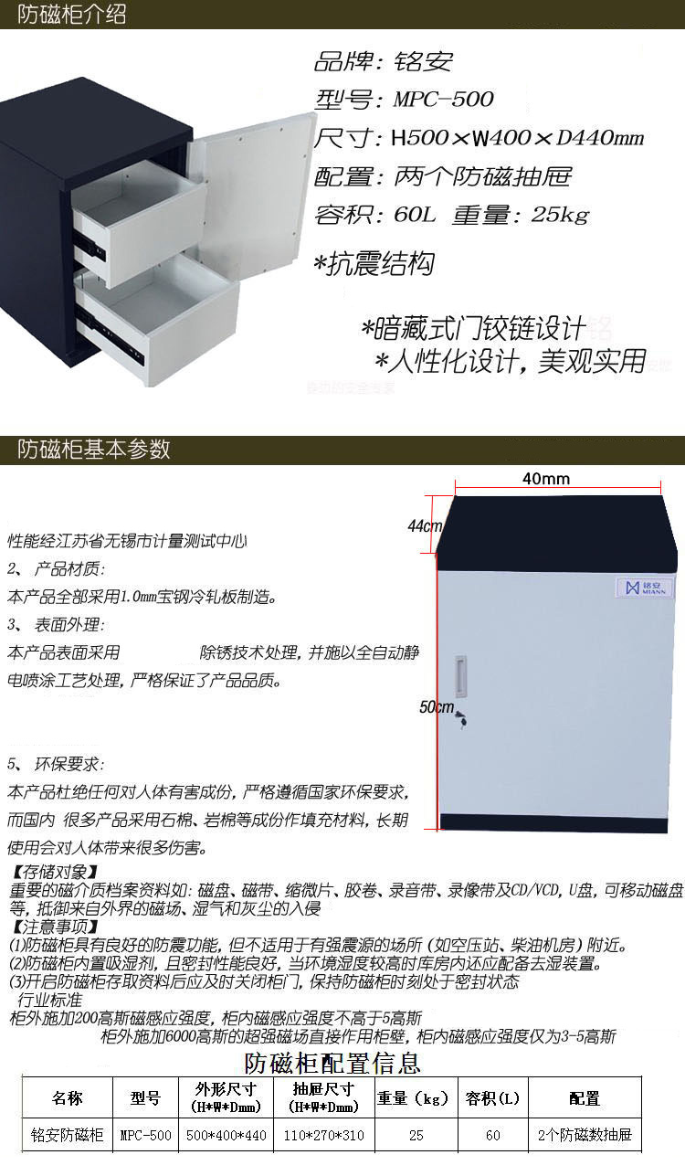 注意事項:A、防磁柜具有良好的防震功能,但不適于有強震源的場所(如空壓站、柴油機房)附近。 B、防磁柜出廠時已內置吸濕劑,且密封性能良好,當環境濕度較高時庫房內還應配備去濕裝置。 C、開啟防磁柜存取資料后應及時關閉柜門,保持防磁柜時刻處于密封狀態。